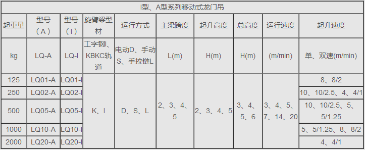 LQ-A龙门式起重机的起重量可达2000公斤,凡是采用悬挂式起重机不可能或不经济的地方都可以方便使用。龙门式起重机可以简单地拆分为几个容易运输的部分,在另一个使用的地方又能很快地装配起来,这一特点在很多场合都有益处。工字钢无轨门式起重机起重量可达2000公斤。