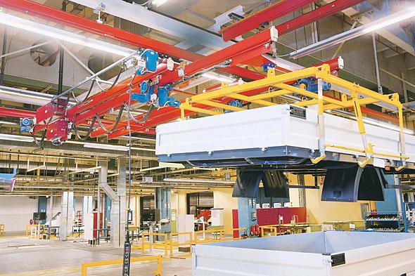 该产品在单梁运行过程中能伸出工作梁在原工作区之外吊运货物。特别是能绕开障碍或搬运物体至较难接近的支撑柱时(如立柱等)能增加辅助工作区域,让特殊物件或设备能够充分利用其使用空间,这一设计将是最理想的方案。 如果需要起吊起重机悬挂范围以外的工件,可采用伸缩梁起重机方案。伸缩梁以主梁为支撑可向一边或两边悬伸出最远 2.5 m 的距离,这使您可以服务到新增起重区域外的工位,比如,可以使你服务到管道下方,暖气管、屋顶之间和厂房立柱之间无法安装起重机轨道的位置,或在类似的障碍物下面进行物流输送。 伸缩梁起重机就是在起重机主梁之间或之下装有一个伸缩梁,根据设计不同,它可以从一边或两边伸出轨道,伸缩梁起重机可以对很难接近的区域服务,例如在立柱之间的区域。 根据您实际工艺所需的悬伸及伸缩尺寸,伸缩梁起重机系统可以分别以标准的KBKC组件和KBKC专用部件组装实现。